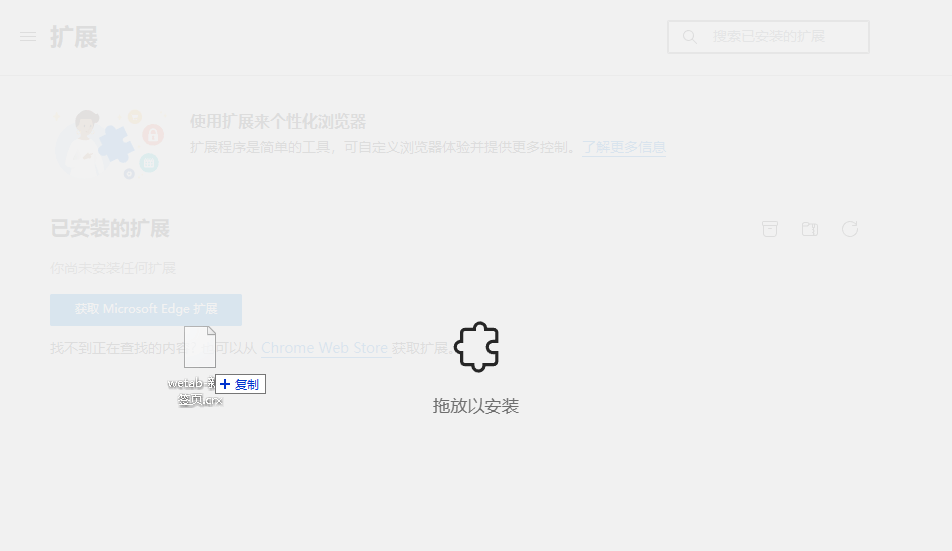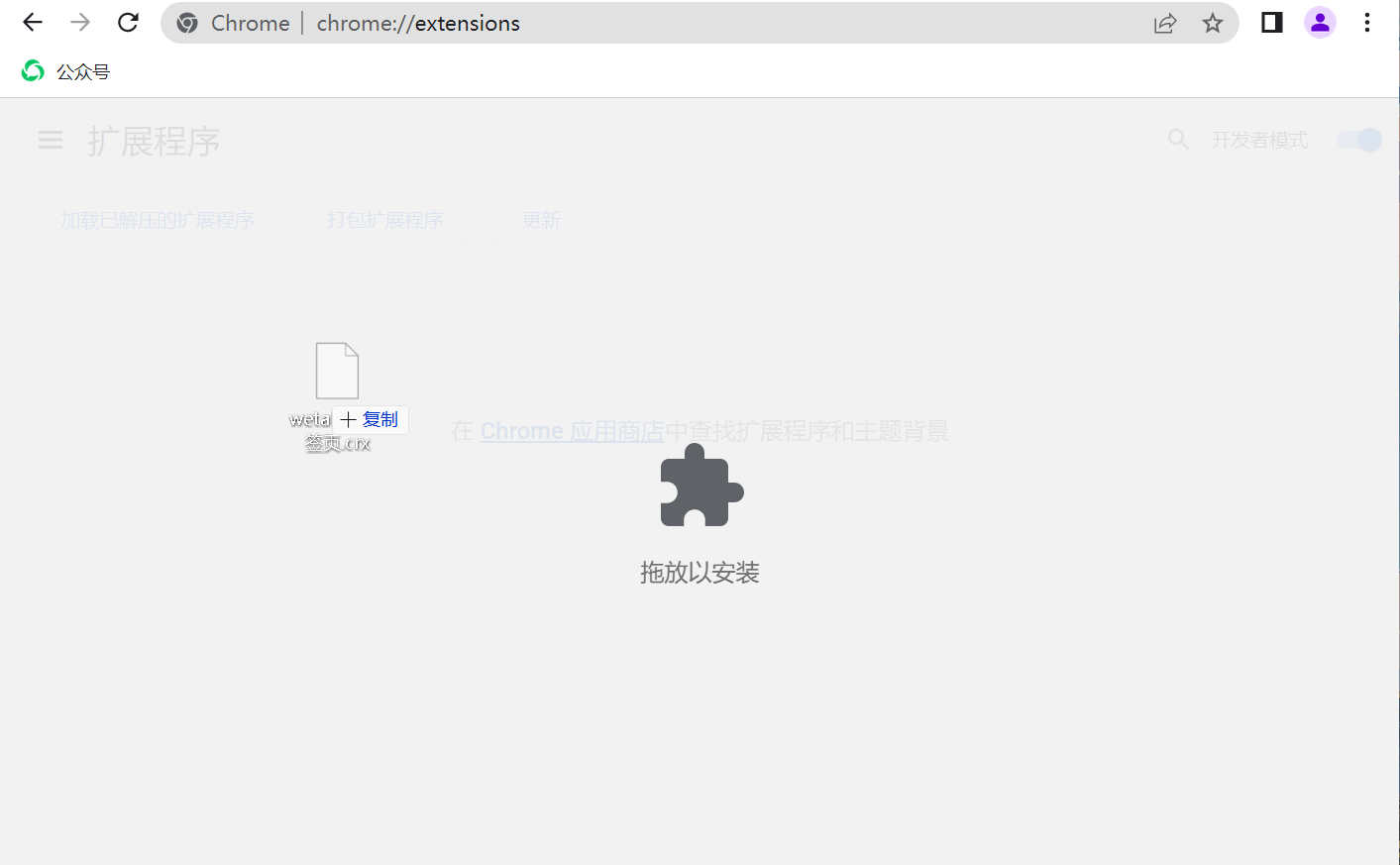 长按鼠标,将解压后的文件夹中的WeTab.crx文件拖拽到扩展管理页面上,松开鼠标左键。